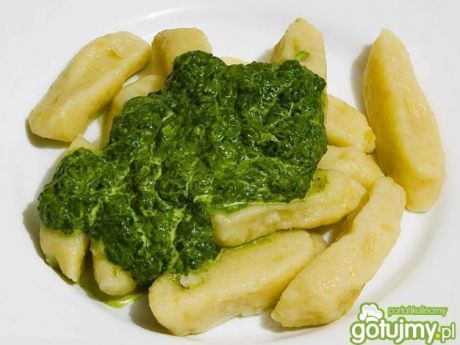 Kopytka z sosem szpinakowymObrane , umyte ziemniaki ugotować i odcedzić. Ostudzić i przecisnąć przez praskę do ziemniaków. Zrobić ciasto na kopytka z masy ziemniaczanej jajka, mąki i szczypty soli. Gdyby ciasto było za kleiste dosypać mąki. Formować wałeczki- spłaszczać i kroić w romby.