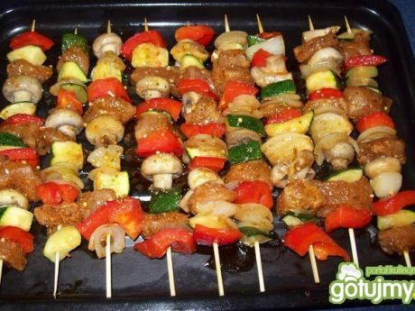 Piersi z kurczaka oraz boczek kroje w grubsze kawałki. Papryki oczyszczam z nasienia, a następnie kroję w kostkę grubszą. Cebulę kroję w grubsze plastry. Ogórki kroję w talarki. Na patyczek do szaszłyków nakładam na zmianę pierś z kurczaka,cebula czerwona, ogórek, papryka żółta, boczek, pieczarka, cebula zwykła, papryka czerwona, pierś z kurczaka. Polewam szaszłyki olejem i posypuję przyprawą do grilla Wstawiam do 180 stopni do piekarnika i piękę 30 minut lub na grilla :) Smacznego